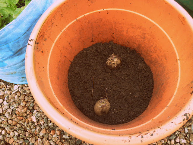I've used some of the soil liberated from the cold frame area to plant up the spare potatoes left over from the allotment. Based on last year's experience the container method seems to give good results and earthing up is simple.